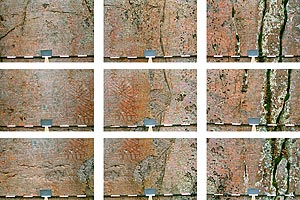 For maximum sharpness a tripod and a small aperture should be used. There is no idea to use unsharp or fuzzy pictures for documentation. If possible photographs should be taken straight towards the painted surface for minimizing perpective distortions. Of course if the paintings are high in the cliff this may be difficult to arrange. At times I have had to take pictures from the distance and use a telephoto lens.