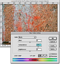 A good and simple way to make the paintings more visible is to increasing the saturation of the painting. The Hue/Saturation -control of Photoshop is ideal for this. So at first a new adjustment layer is created (Layer New adjustment layer Hue/Saturation). From the Hue/Saturation -window red colours are selected and the saturation level is pushed from zero to +50 +80. All the red areas of the picture increase in saturation. You can also limit the effect to exactly the right tones with the spectral controls in the bottom of the window. If the preview is turned on the difference is seen while working, and it is easy to see the effect. (2015: The tools of Photoshop look a bit different in the current version, but the functions are about the same.)