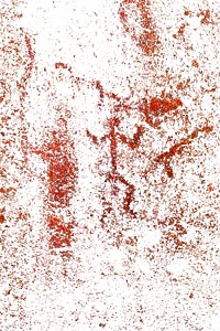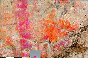 Increasing the saturation is quite ideal way to make the paintings more visible. The computer selects all the tones you want. It does not miss any detail or add anything to the painting. It also leaves the backgroung untouched. It is possible to check if a missing part of the painting is due to later damage or if a crack on the rock has effected the way paintings are presented.
