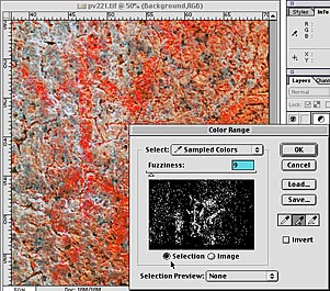 When any colour of the picture is clicked, all similar pixels are selected. Increasing fuzziness selects more pixels close to the clicked. I usually use fuzziness amount 10 40. If another colour is clicked with the Add to Sample -tool all the pixels of the two colours are selected. When selecting the colour of the rock painting all the tones of the painting should be selected. The progress of the work can be followed in the little preview of the Color Range -window. If Selection Preview: White Matte is selected it is possible to see the result in the original picture as well. When all the tones from the painting (and none from the background) are selected OK is clicked and the final selection is made.