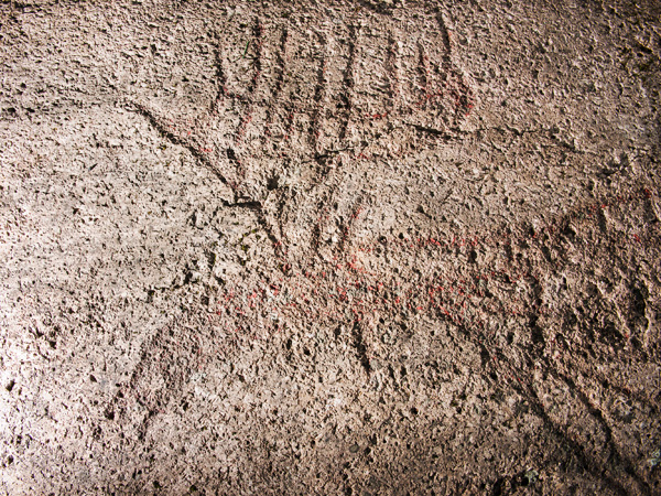 Stone Age rock carvings, painted. A big elk is carves on a rock in a park. It has been painted red, but the colour is weak. Sidelight reveals the fine details of the animal. Puiston keskellä on kallio, johon on hakattu suurikokoinen hirvi. Se on joskus maalattu punaisella, mutta väristä on jäljellä vain rippeitä. Sivuvalo paljastaa eläimen vartaloon tehdyt hienot yksityiskohdat.