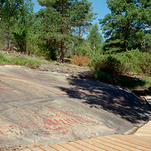 L1968:7148 et al., raä 12–28, Tanum sn Bronze Age rock carvings, partly painted. Aspeberget rock carving site is part of the Tanum world heritage site. There are several fields by the path. Some of them are covered to protect the carvings. The main field is rich of elegant carvings. Aspebergetin kalliopiirrokset kuuluvat Tanumin laajan kalliopiirrosalueen kohteisiin. Polun varrella on useita kalliopiirrospaikkoja. Osa on peitetty eroosion estämiseksi.