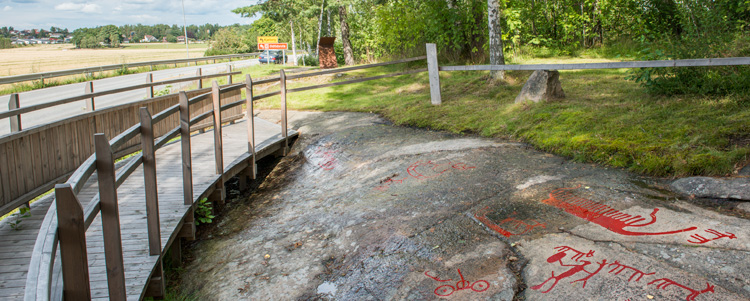 Bronze Age rock carvings, painted. About 60 figures are carved on the rock opposite to the shopping center. Ships, different human figures, animals and wagons. Ostoskeskusta vastapäätä sijaitsevaan kallioon on hakattu noin 60 kuvaa. Veneitä, erilaisia ihmishahmoja, eläimiä ja vaunuja.