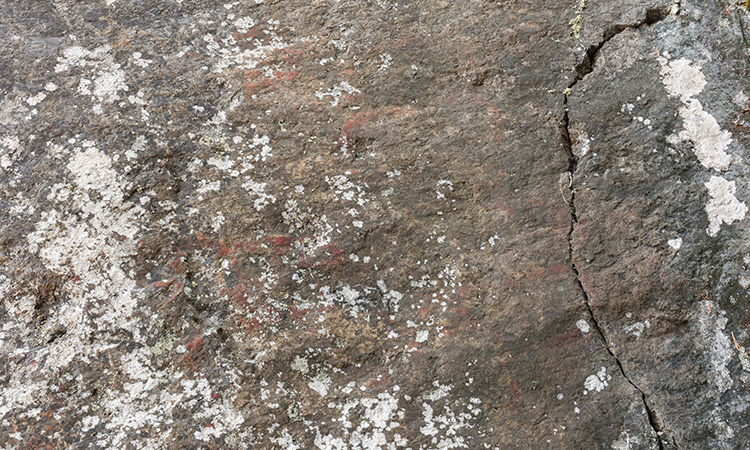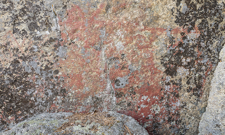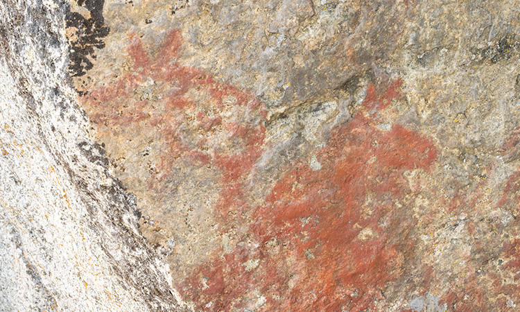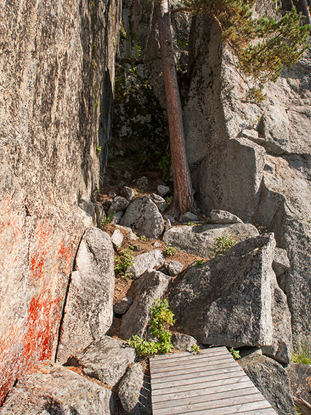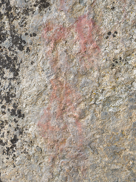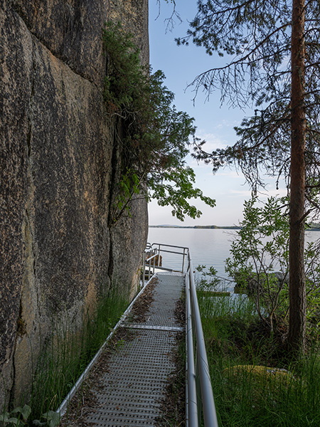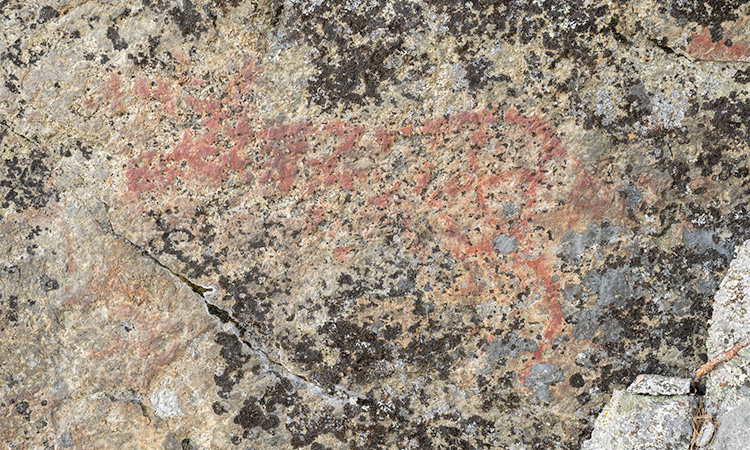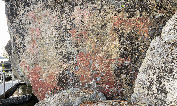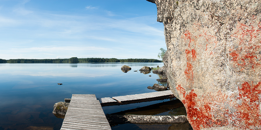 L1946:6544, L1946:6696, L1946:7264, raä 332, Ström sn Stone Age rock paintings. A guided pathway and a platform lead visitors to Fångsjön rock paintings. The place is impressive and the paintings in the wide main field are well preserved. At least ten elk figures are easy to identify in the main field, but there are more of them. In spite of the two rightmost animals the elks are quite small. There are also some possible human figures and a net-like figure in the main field. There are more paintings deeper in the cove, but the rock surface is eroded. Three elks can be found in the end of the cove. Fångsjönin kalliomaalauksille johtaa opastettu polku, joka päätyy kallion eteen johtavalle laiturille. Maalaus on laaja ja melko hyvin säilynyt. Kallion sisään johtavan solan seinämästä tunnistaa helposti kymmenen hirven kuvaa, mutta niitä on enemmänkin. Kahta oikeanpuolimmaista lukuunottamatta hirvet ovat melko pieniä. Vasemmanpuoleisin hirvi on muodoltaan erikoisen pyöreä. Hirvien lomasta voi etsiä mahdollisia ihmishahmoja. Kallion alaosan puuroutuneen värin yläpuolella on myös verkkokuviota muistuttavia viivoja. Syvemmällä solassa maalauksia on lisää, mutta kallion pinta on kuluneempi. Kun rinnettä kipuaa ylös, löytää vielä kolmen hirvikuvan jäänteet.