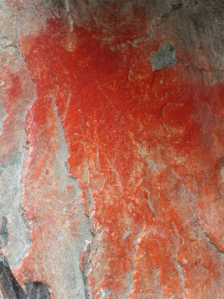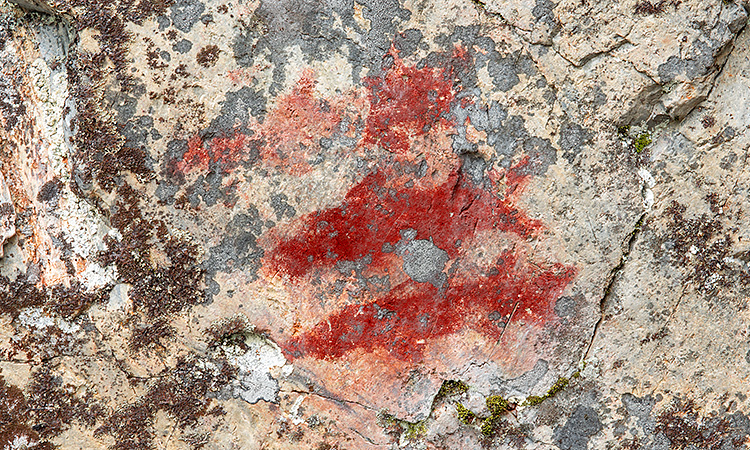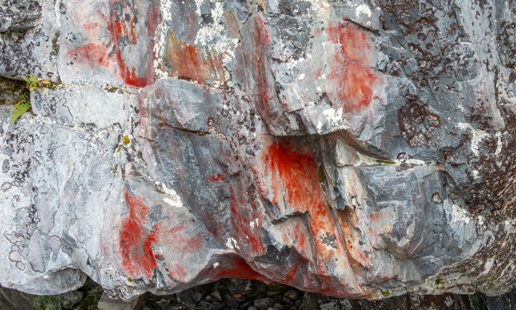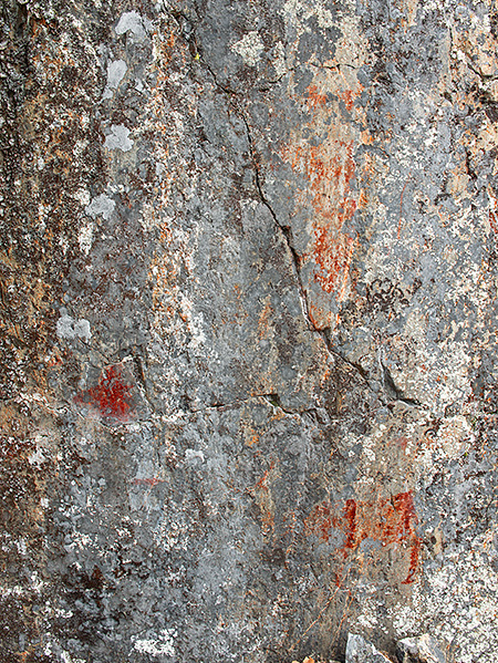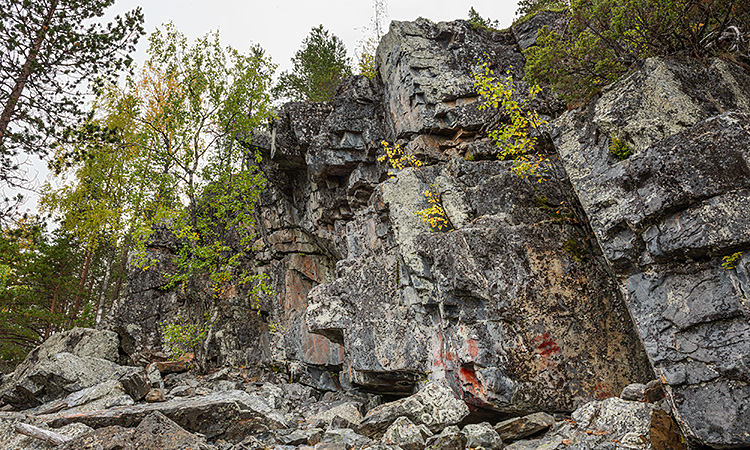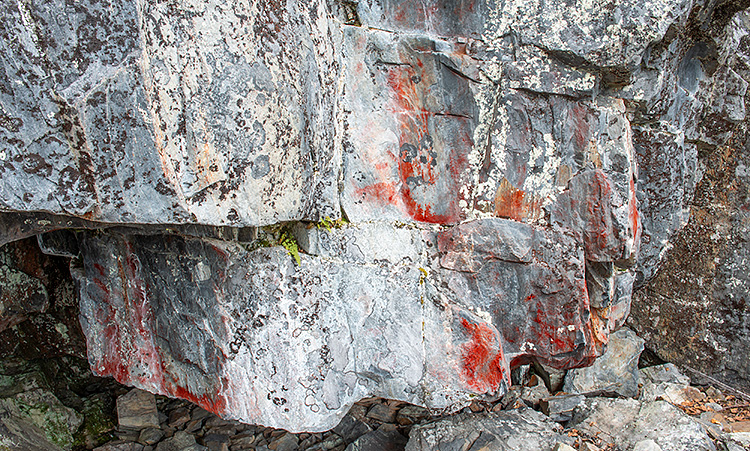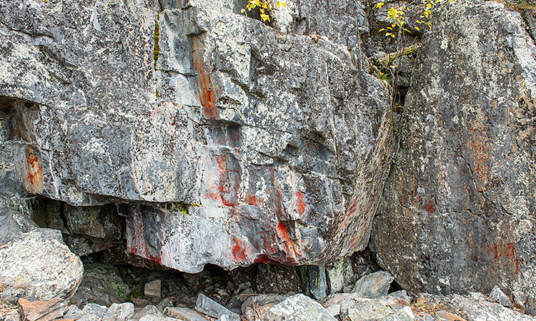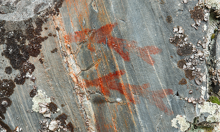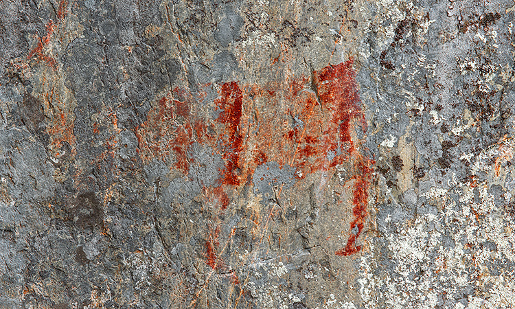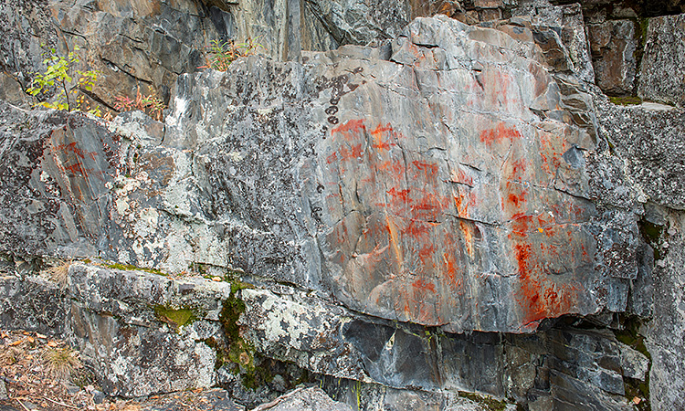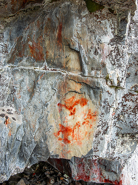 L1937:7117, raä 118, Skellefteå sn Stone Age rock paintings. The eastern site of the Finnforsberget rock painting is quite a unique case. The imagery of the site consists mainly of fish. There is also a human figure scratched on the red background. Finnforsbergetin itäisempi maalauspaikka on erityinen. Maalauksen kuvasto koostuu pääasiassa kaloista. Maalauksesta löytyy myös punaiseksi maalatulle pinnalle raaputtamalla tehty ihmishahmo.