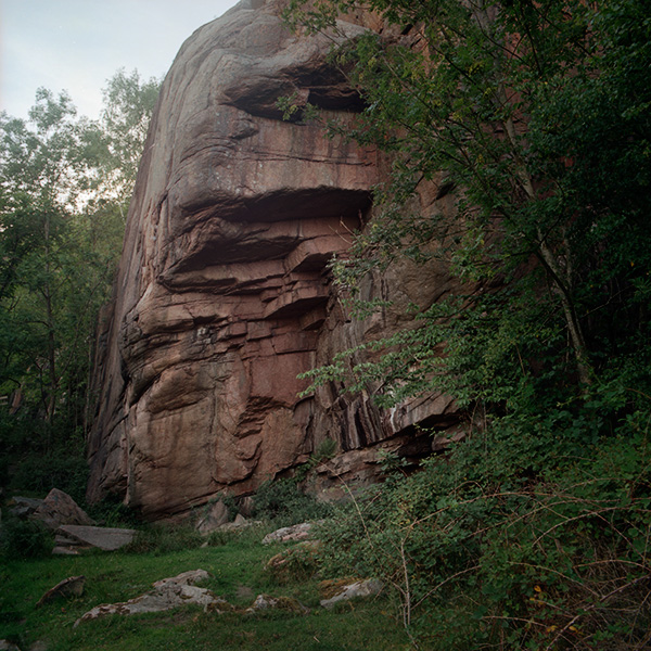 L1970:5512, raä 598:1, Bro sn Rock painting, not dated. Häller rock paintings are located in the root of a massive cliff. Red figures are difficult to identify. Hällerin kalliomaalaukset sijaitsevat vaikuttavan kalliojyrkänteen alaosassa. Punaiset kuviot ovat huonosti tunnistettavissa. Lähinnä ne yhdistää kömpelöhköön vanekuvioon.