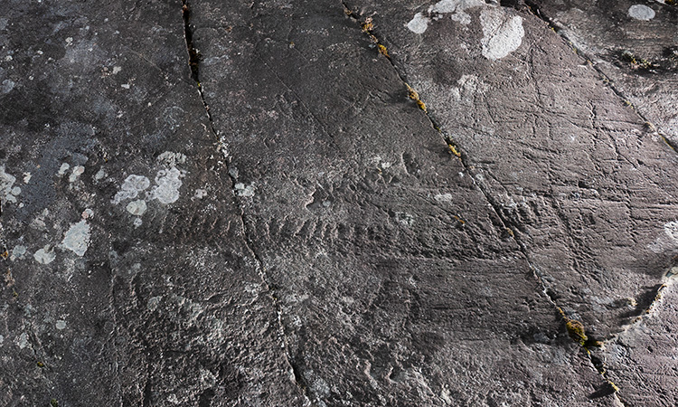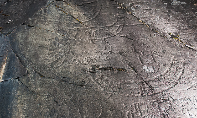 Bronze Age rock carvings, unpainted. There are no guides or signs to the Hammer rock art site. I found only one of the 18 fields in the area. The field lies right next to the road in a vertical cliff. Boat figures are clearest images in the unpainted rock, but there is much more if you can look at the rock with light from the side. Hammerin kalliopiirrosalueelle ei ole opasteita. Alueen 18 piirroskentästä löysin yhden. Se sijaitsee pystyssä kalliossa aivan tien vierellä. Maalaamattomasta kalliosta parhaiten erottuvat venekuvat, mutta siellä on paljon muutakin, jos vain pääsee tarkastelemaan kalliota sivuvalossa.