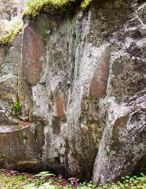 L1945:6, L1945:23, L1946:9949, raä 398–400, Åre sn Stone Age rock paintings. Hamrebacken rock paintings lie next to a slalom slope. There are three sites. The first site is in a large boulder. Several red areas are visible, but the only clear figure is a strange human. Second place is in the corner of a cliff. An elk. The third place is almost on the slalom slope. Badly preserved lines are hardly visible. Hamrebackenin kalliomaalaukset sijaitsevat rinteessä laskettelurinteen vierellä. Maalauksia on kolmessa paikassa. Laakean kivenlohkareen tasaisiin pintoihin on maalattu punaista väriä. Selvin kuvio on erikoinen ihmishahmo. Toinen paikka on jyrkänteen kulmassa, johon on maalattu hirvi. Kolmas paikka löytyy aivan laskettelurinteen viereltä. Kalliossa on hyvin heikosti säilyneitä kulmaviivoja.