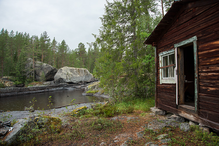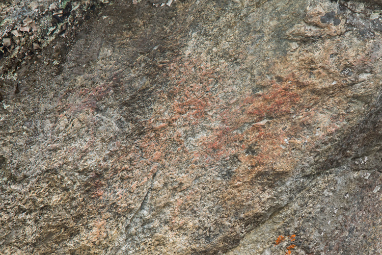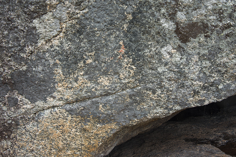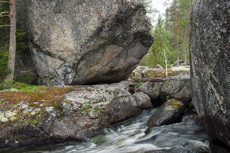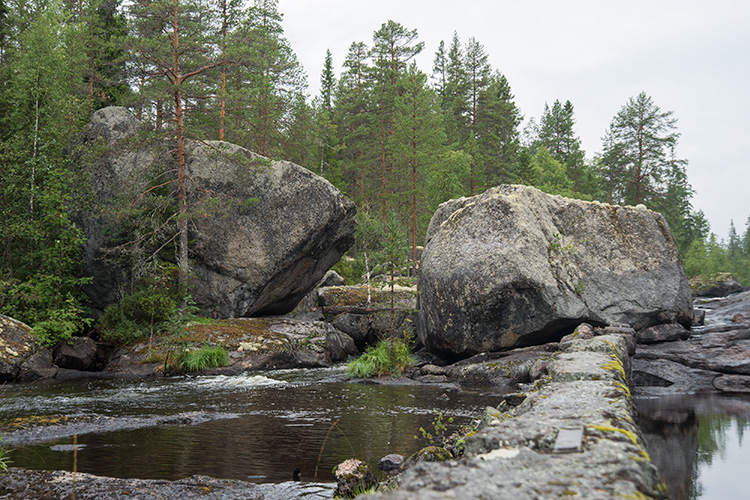 L1945:8760, raä 616, Fjällsjö sn Stone Age rock paintings. The Harahällan rock paintings are located at two erratic boulders on both banks of the rapids. Unfortunately I didn't find a safe way to cross the stream, and I had to look at the site 1 (SW) from a distance. However two elks are clear in photographs. I only recognised a tiny spot of colour from the site 2 (NE). Harahällanin kalliomaalaukset sijaitsevat kahdessa siirtolohkareessa pienen kosken molemmin puolin. Valitettavasti en löytänyt turvallista reittiä virran yli, joten lounaisen ensimmäisen paikan maalaukset tavoitin vain etäältä. Kuitenkin kaksi hirveä tuli hyvin esiin valokuvista. Koillisesta toisesta maalauksesta erotin vain pienen väriläiskän jäkälän lomasta.