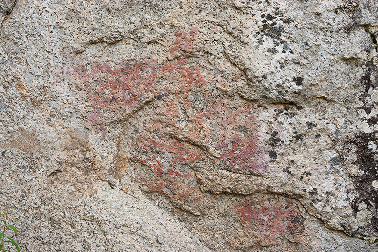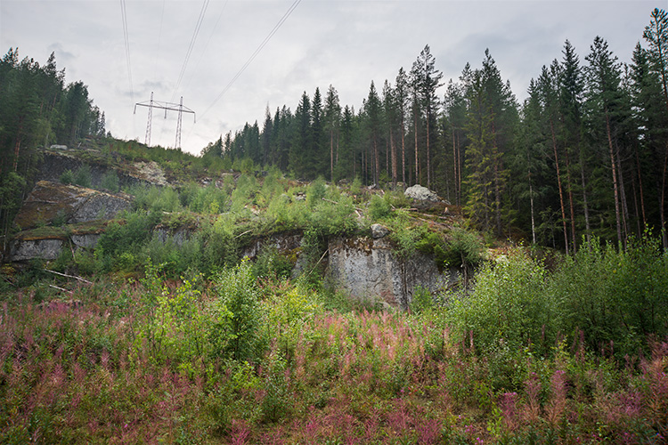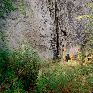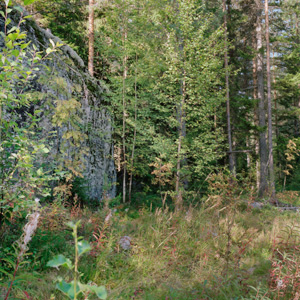 L1935:4197, raä 160:1, Ramsele sn Stone Age rock paintings. There are four rock painting sites in Högberget. Högberget I lies under the power line close to the road. The painting consists several coloured spots, that may have been elks. The clearest figures are on the top. At first it seems there is an elk facing right, but more probably there are two elks facing left. The other sites in Högberget are more difficult to access. Högbergetin alueella on neljä kalliomaalauspaikkaa, joista ensimmäinen sijaitsee metsätien vierellä, voimalinjan alla. Högberget I:n maalaus koostuu värijäljistä, jotka lienevät olleet hirvikuvia. Selvimmät kuviot ovat ylinnä. Ensivaikutelma kertoo oikealle katsovasta hirvestä, mutta tarkemmin katsottuna paikalla lieneekin kaksi vasemmalle suuntaavaa hirveä.