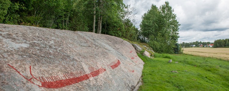 Bronze Age rock carvings, painted. The largest images of ships in Norway are at Hornnes. 21 ships, some cups and a human figure are carved on an impressive panel in a beautiful rural landscape. Hornnesissa ovat Norjan suurimmat venekuvat. 21 venettä, kuppeja ja ihmishahmo on hakattu viistoon kallioon kauniissa maalaismaisemassa. Kokonaisuus on hieno.