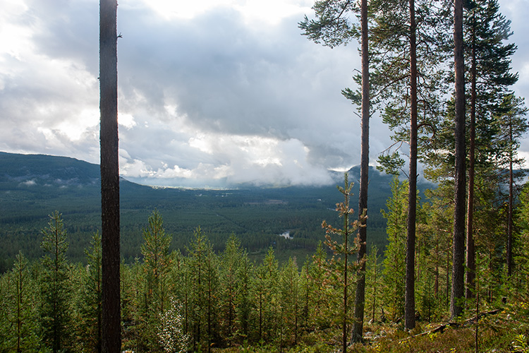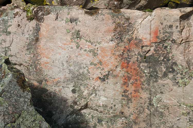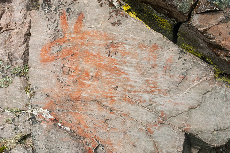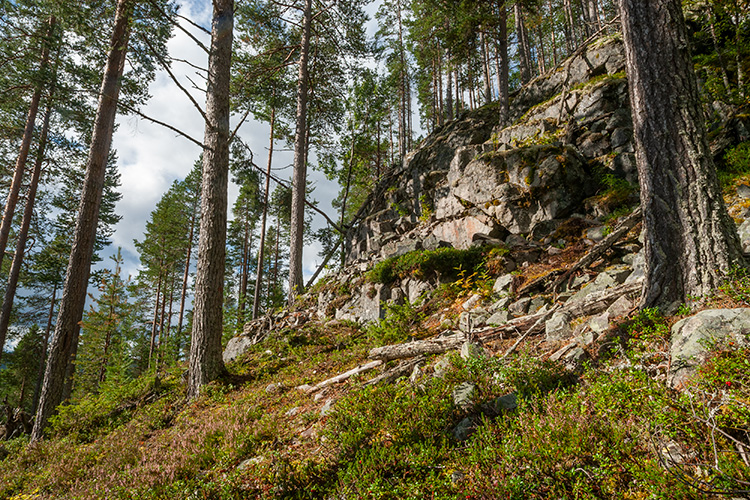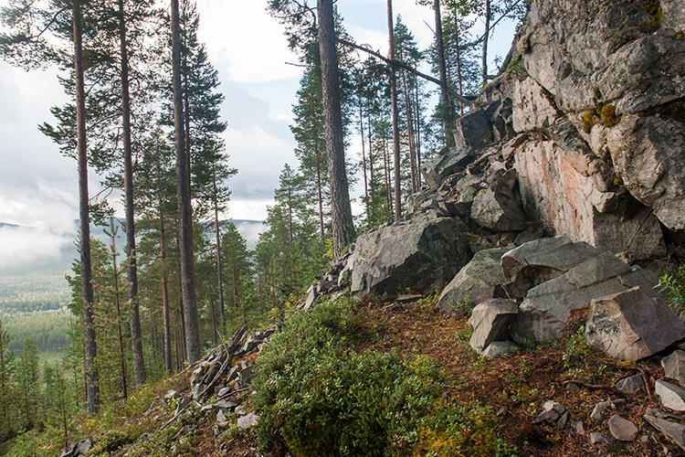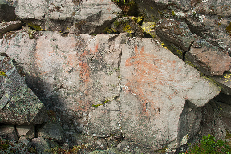 L1945:1765, raä 301, Hede sn Stone Age rock paintings. Hovden rock painting consists of several figures, but only the elk on the right is clear. Behind the elk there may be another and on the left there is maybe a human figure. View east over the young forest is beautiful. Hovdenin kalliomaalauksessa on useita kuvioita, mutta vain hirvi oikealla on selvästi tunnistettavissa. Sen takana saattaa olla toinen hirvi. Vasemmalta voi hakea ihmisen hahmoa. Taimikon yli itään avautuva näköala on hieno.