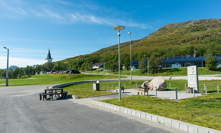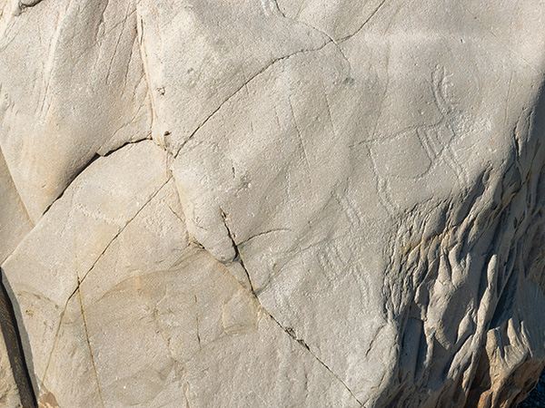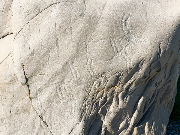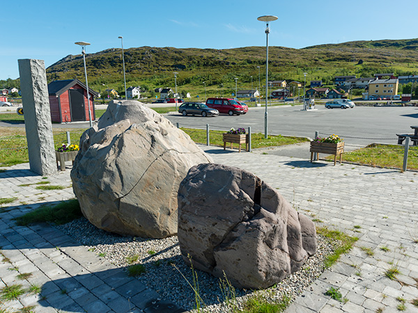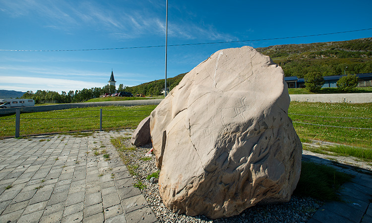 Stone Age rock carvings, unpainted. Two stones with carvings lie in the center of Kvalsund. They are brought here from some other places in the area. Three deer and some other figures are carved on blocks. Kvalsundin keskustassa lepää kaksi lohkaretta, joissa on kalliopiirroksia. Kivet on kuitenkin tuotu paikalle jostain lähistöltä. Paikka ei ole alkuperäinen. Kolme peuraa ja muutamia muita kuvia on hakattu kiviin.