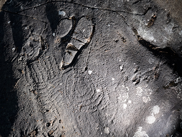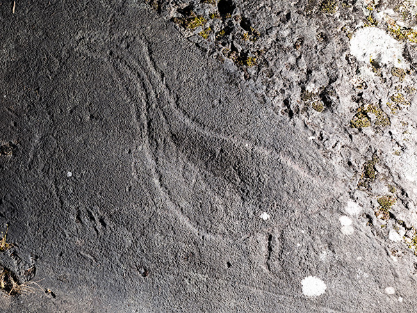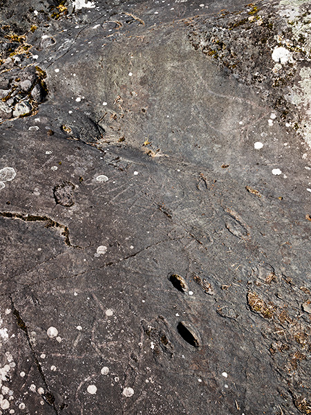 Prehistoric rock carvings. There are lots of images at the Lånke rock carving site, but unpainted figures are partly under lichen and moss and thus diffucult to find and see in bright daylight. Here are just some examples: a bird, fish, geometric figures and a fine bird-headed anthropomorph. Lånken kalliopiirrospaikalla on runsaasti kuvia, mutta ne ovat maalaamattomia sekä osittain jäkälän ja sammalen alla. Kuvia on vaikea löytää ja nähdä kirkkaassa päivänvalossa. Niinpä tässä vain joitakin esimerkkejä: lintu, kaloja, geometrisia kuvioita sekä hieno lintupäinen ihmishahmo.
