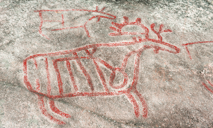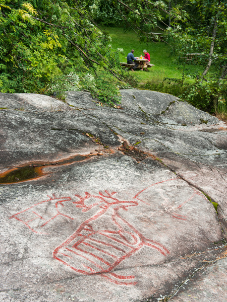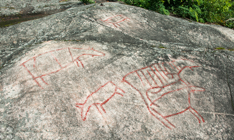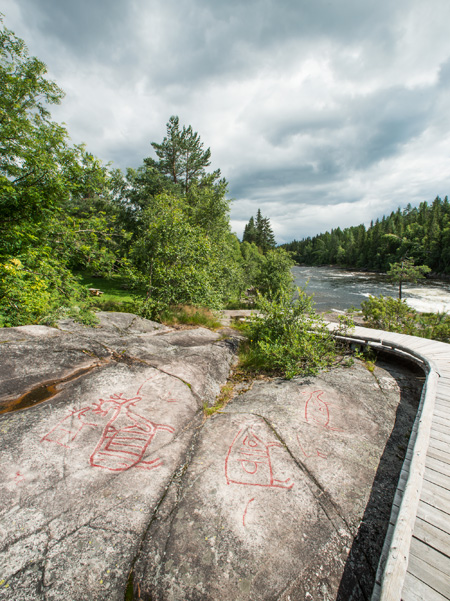 Stone Age rock carvings, painted. About ten elks and some other figures are carved on the rock by the rapids of the river Etna. The highway runs behind the trees. A path leads from the resting place to the viewing platform. Etnajoen kosken kiviselle rannalle on hakattu kymmenkunta hirveä ja muutamia muita kuvioita. Puiden takaa kulkee tie ja paikan vieressä on pysähdyspaikka, josta johtaa polku katselulavalle.