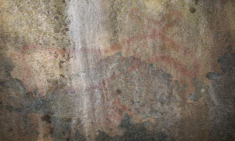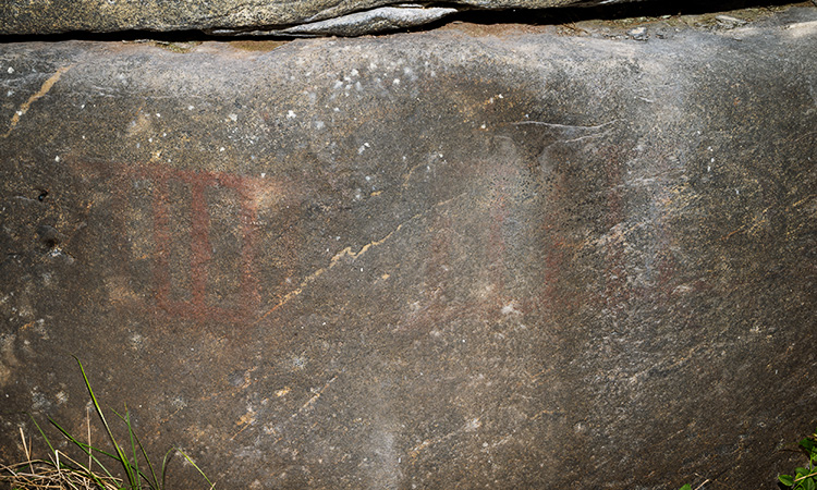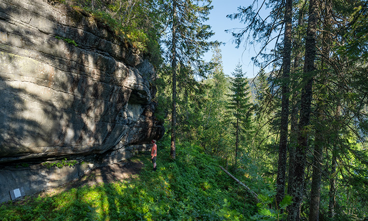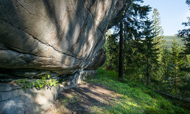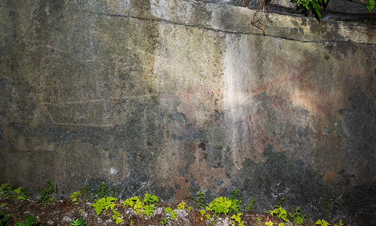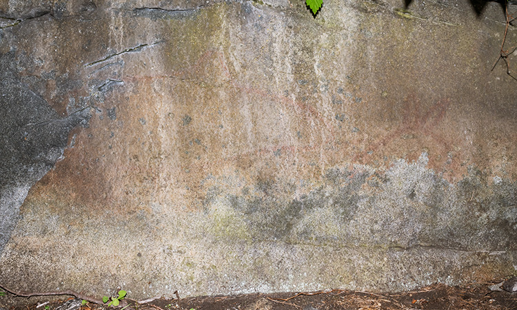 Prehistoric rock paintings and carvings. There are two types of rock art at Sandhalsan: Stone Age paintings and probably Bronze Age carvings. On the left there is a nice painted elk. On the left side of the elk are carvings: a boat and two humans with spears. There are more carvings overlapping the elk, but they are not that clear. Some meters right from the elk are more paintings: fragments of a whale and an elk. Further right there are geometric figures in at least two panels. Sandhalsanin kalliossa on kahden tyyppistä kalliotaidetta: kivikautisia maalauksia ja luultavimmin pronssikaudelle ajoittuvia piirroksia. Maalausalueen vasemmalla reunalla on hieno maalattu hirvi. Sen vasemmalla puolella kallioon on hakattu venekuva ja kaksi keihäin aseistautunutta ihmishahmoa. Piirroksia on myös hirven päällä, mutta ne erottuvat heikommin. Pari metriä hirvestä oikealle on lisää maalauksia: katkelmalliset valas ja hirvi. Etäämmällä oikealla on vielä geometrisia kuvioita ainakin kahdessa kohdassa.