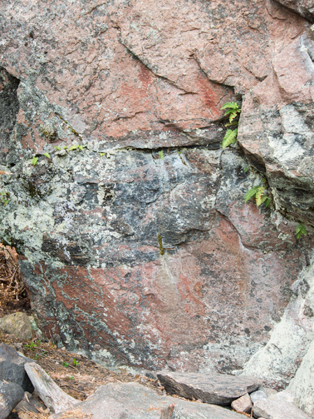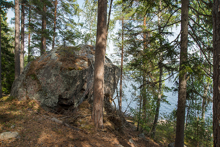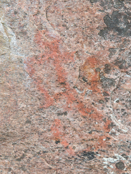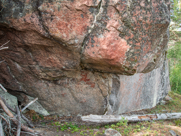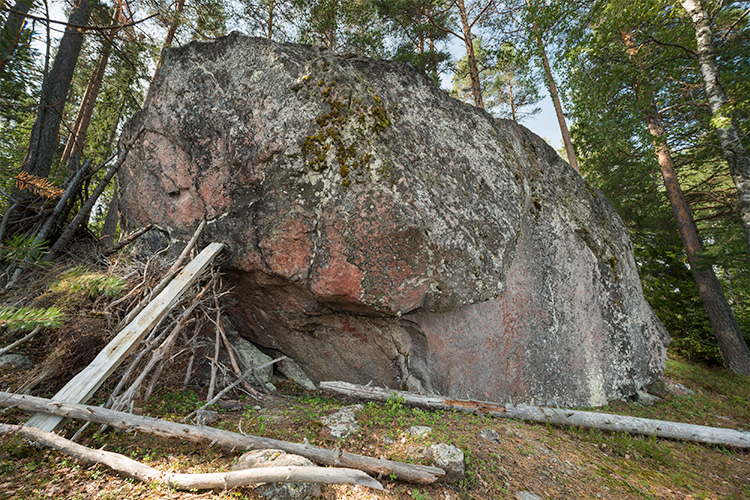 L1951:9140, raä 3:2, Ljusdal sn Stone Age rock paintings. The Skinnlipsstenen rock painting is located on an erratic boulder on the shore of the lake Letssjön. There are paintings on two sides of the boulder. The best preserved figure is a human with bent knees, but there are some fragmentary elks, too. Skinnlipsstenenin kalliomaalaus on tehty Lettsjönin rannalla sijaitsevaan siirtolohkareeseen. Maalauksia löytyy kiven kahdelta kyljeltä. Parhaiten on säilynyt koukkupolvinen ihmishahmo, mutta myös katkelmia hirvistä on havaittavissa.