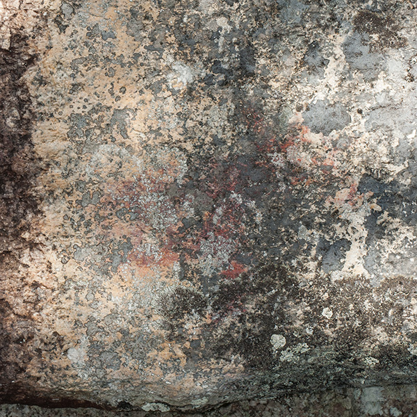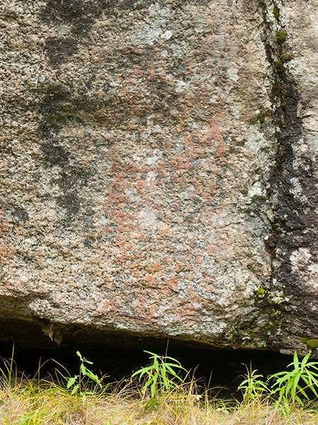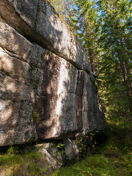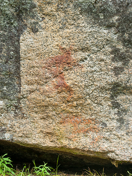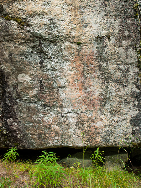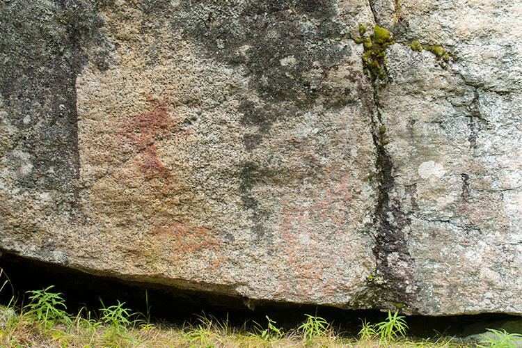 L1937:5585, raä 151, Åsele sn Stone Age rock paintings. The rock paintings in Storberget stand in a vertical cliff in the middle of a forest. At least four elk figures can be identified. Storbergetin kalliomaalaukset sijoittuvat metsän keskellä kohoavan pystyn kallion alaosaan. Tumma valuma jakaa kallion kaistoihin, joissa tutun punaiset maalaukset sijaitsevat. Kuvioista on tunnistettavissa ainakin neljä hirveä.