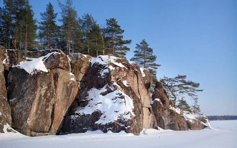 Vaikuttavan muotoisessa kalliorannassa on punertava, sisäänpäin kääntynyt tasainen seinämä. Tämän seinämän halkaisee syvä pystysuora kolo, jonka reunassa erottuu pahoin kulunut pyöreäpäinen ihmishahmo.