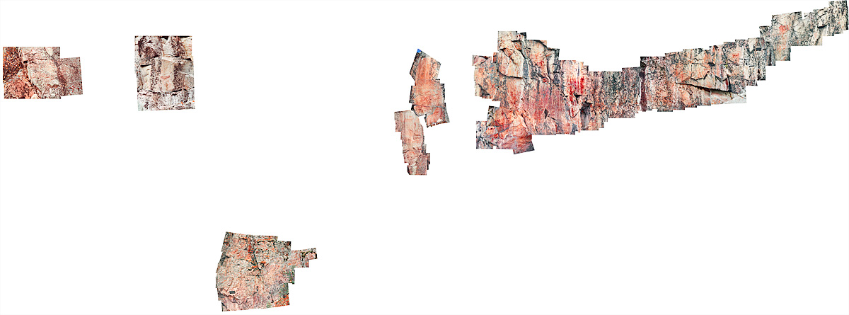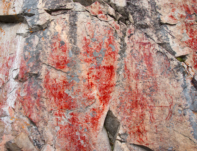 Laaja esihistoriallinen kalliomaalaus, jossa on tunnistettavia kuvioita.