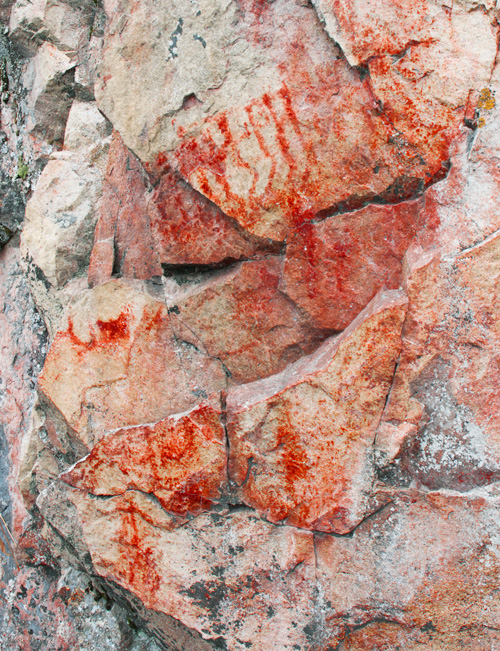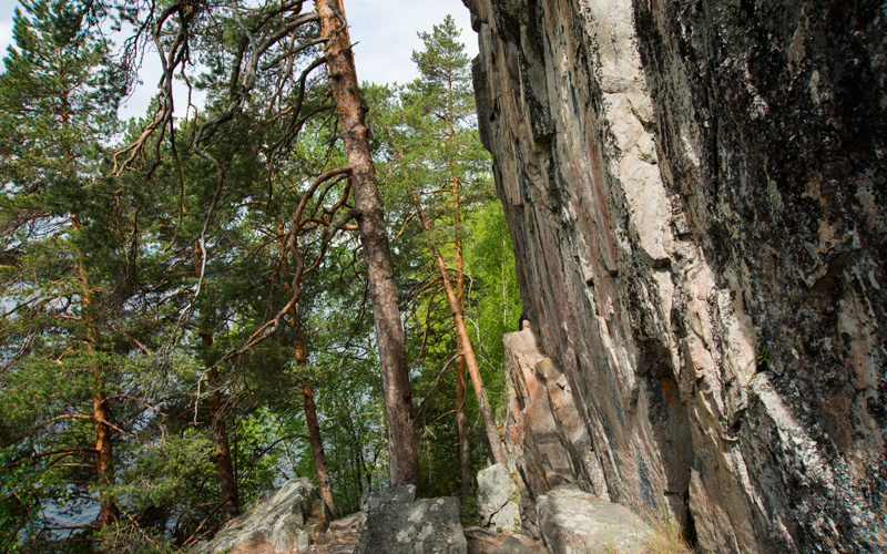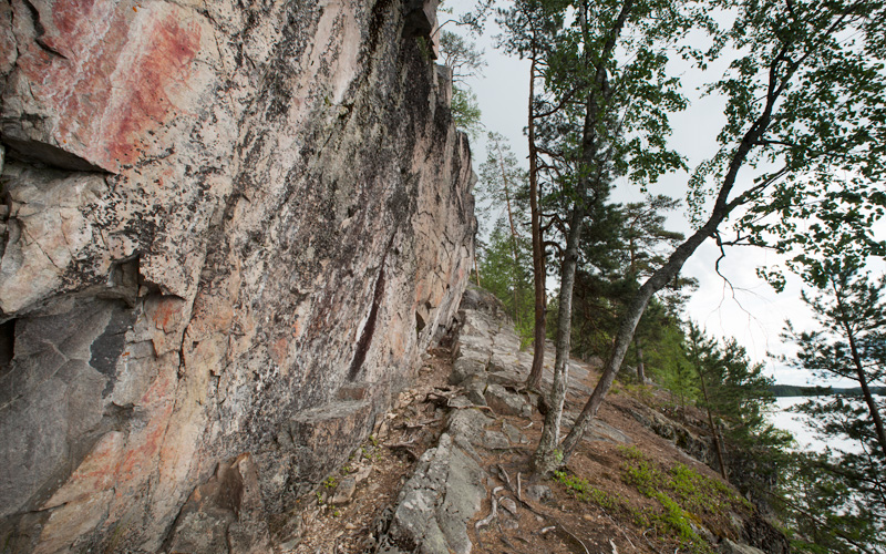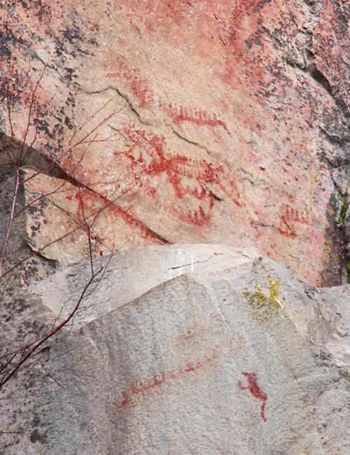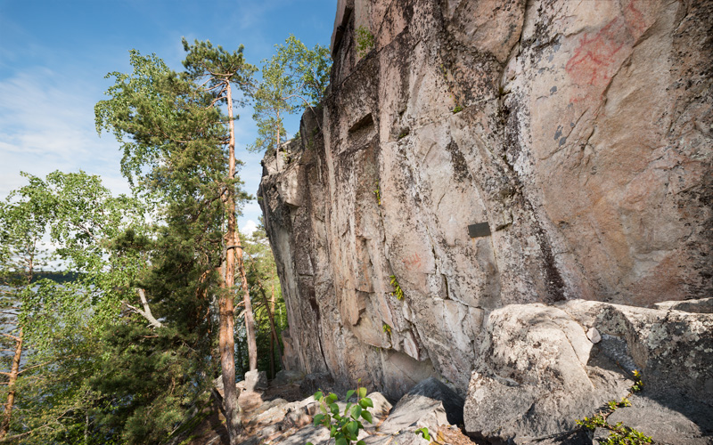 Terassia noustessa kannattaa vilkuilla ylös, kuvia on harmaassa kallionkulmauksessa sekä korkealla sen yläpuolella. Vaikeasti saavutettavan kalliokielekkeen yläpuolella on lukuisia suuria venekuvia, sekä osin niiden päällä leveällä viivalla vedetty rasti.