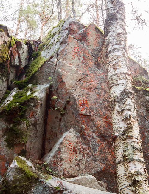 Kallion ylin kuvio on vasemmalla kallionkulmassa sijaitseva pieni, himmeäksi haipunut ihmishahmo. Hieman alempana kallionkulmassa on toinen, paremmin erottuva ihmishahmo. Pää ja kohotetut kädet ovat tunnistettavissa, mutta hahmon alaosa jää jäkälän alle. Ihmishahmon oikealla puolella on neljän päällekkäisen eläinhahmon muodostama tiivis sommitelma. Oikealle katsovat eläimet on hahmotettu yhdellä viivalla. Kuvioiden alapuolella kalliossa on katkonaisia värijälkiä, jotka jäävät pahasti jäkälän alle. Kallion oikeassa reunassa on vielä pysty kuvioyhdistelmä.