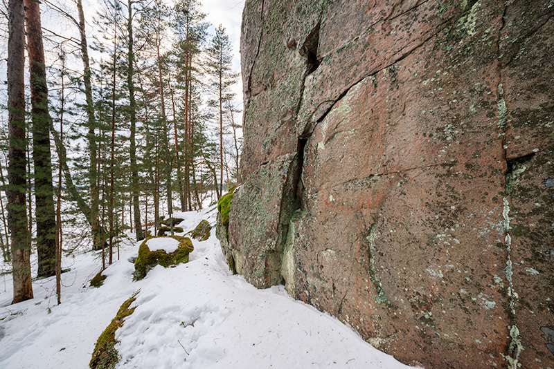 Laaja kallioseinämä peittyy puuta kasvavan leveän rantakaistan taakse. Kallion molemmin puolin on rakennettu kesämökki. Tasaiseen kallioon on maalattu suurikokoinen venekuva, josta voi laskea kaksitoista miehistöviivaa. Tästä yläoikealle kalliossa on pienempi venekuvio ja kauempana oikealla vielä pieni pysty värijälki sekä levinnyttä väriä.