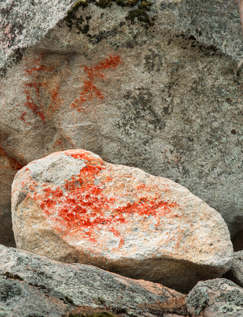 Metsäisen rinteen puolivälissä suuren kalliolohkareen alle jää onkalo. Onkalon reunusta kiertää punainen nauha ja sen ylle kohoava kivinen lippa on värjätty. Voimakasta väriä on myös onkalon edessä oikealla olevan kiven etupinnassa. Kivestä on mahdollisesti tunnistettavissa oikealle katsova eläinhahmo.