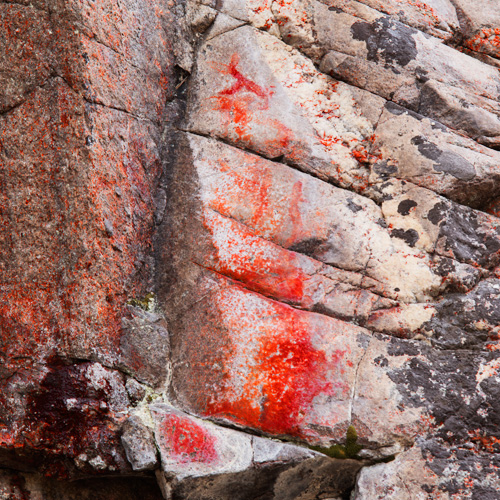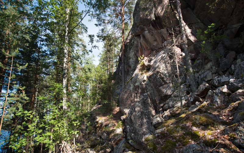 Muutaman metrin kauempana oikealla, lohkeilleen kallion takana sijaitsevassa kallionulkonemassa on myös levitettyä väriä sekä ainakin yksi eläinhahmo.