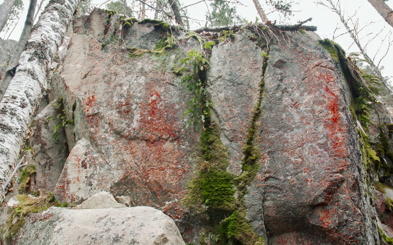 Kallion ylin kuvio on vasemmalla kallionkulmassa sijaitseva pieni, himmeäksi haipunut ihmishahmo. Hieman alempana kallionkulmassa on toinen, paremmin erottuva ihmishahmo. Pää ja kohotetut kädet ovat tunnistettavissa, mutta hahmon alaosa jää jäkälän alle. Ihmishahmon oikealla puolella on neljän päällekkäisen eläinhahmon muodostama tiivis sommitelma. Oikealle katsovat eläimet on hahmotettu yhdellä viivalla. Kuvioiden alapuolella kalliossa on katkonaisia värijälkiä, jotka jäävät pahasti jäkälän alle. Kallion oikeassa reunassa on vielä pysty kuvioyhdistelmä.