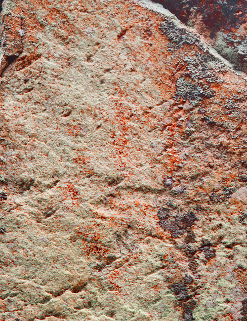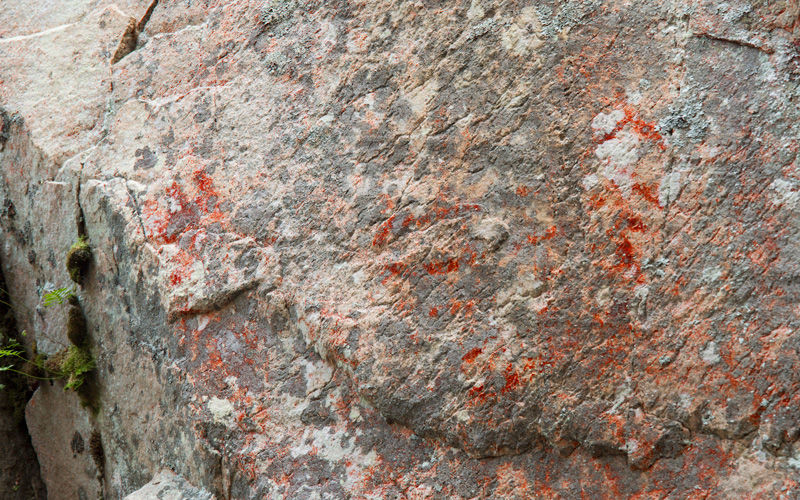 Ajan syömä esihistoriallinen kalliomaalaus, jossa on tunnistettavia kuvioita.