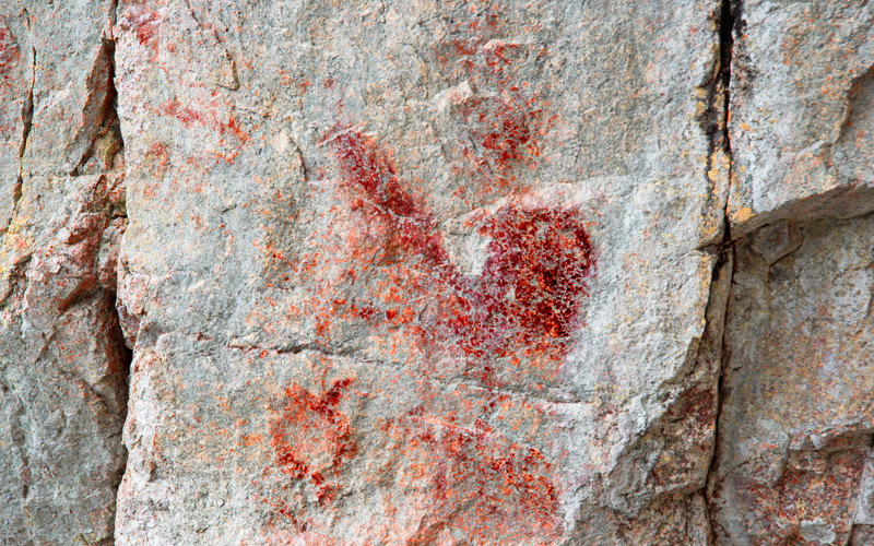 Massiivinen kallio ja komea puoliluola, jonne on rakennettu katselutelineet. Tunnistettava ihmishahmo on kallionkulmassa telineiden tuntumassa. Lisäksi alempana vasemmalla on tunnistamattomia punaisia jälkiä.