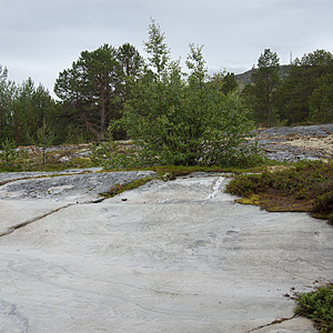 Stone Age rock carvings, unpainted. In Amtmannsnes, Alta (about 2700–1700 BC) there are carvings in three wide fields. The carvings are unpainted and difficult to see, if the light is not good. The imagery is rich and peculiar. The rocks lie in a forest next to the football field, surrounded by industry, houses and the sea. Altan Amtmannsnesissä (n. 2700–1700 eKr.) on kalliopiirroksia kolmella laajalla kentällä. Maalaamattomia piirroksia on tasaisessa päivänvalossa vaikea erottaa vaaleasta kallionpinnasta. Kuvasto on kuitenkin runsas ja omaperäinen. Kalliot sijaitsevat teollisuushallin, asutuksen ja meren väliin jäävässä metsässä, jalkapallokentän vierellä.