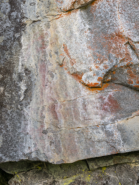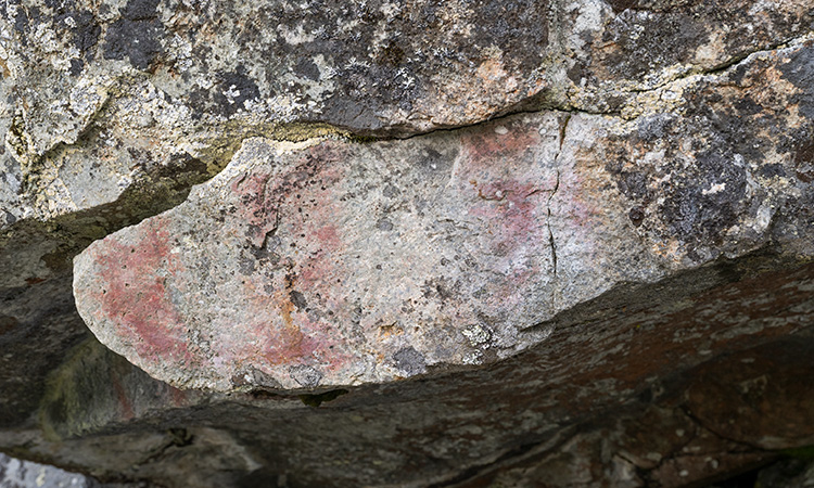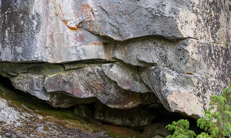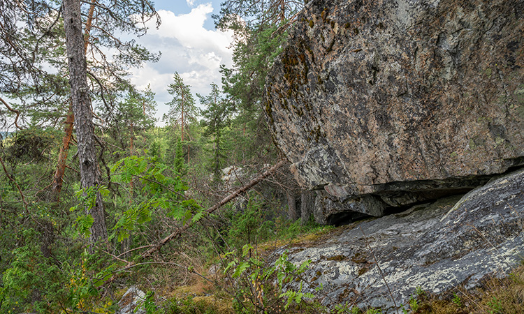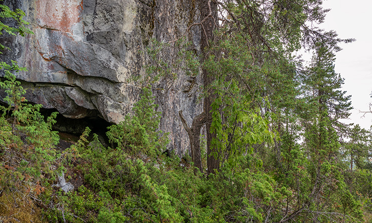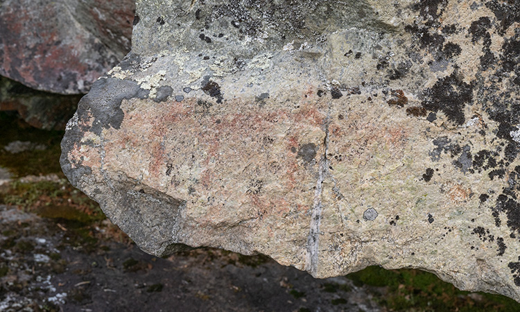 L1937:7137, raä 117 Skellefteå sn Stone Age rock paintings. The Norsjömorberget rock painting is located on a cliff rising over a rocky slope. Not the easiest place to reach. There are quite many painted surfaces, but only one includes clear figures: two or three cervids. Up left from the animals is an area covered by white silicon oxide. More elks can be found there, but they need humidity to become visible. A few meters left from the main panel is a smaller panel on the tip of the rock. No figures can be identified. Norsjömorbergetin kalliomaalaus sijaitsee louhikkoisen rinteen yläpuolella kohoavassa kalliossa. Paikka on hieman hankalasti saavutettavissa. Pääkentällä on useita pintoja, joissa on punaista väriä, mutta vain yhdestä voi tunnistaa kuvioita: kaksi tai kolme hirvieläintä. Eläimistä ylävasemmalle on piioksidin peittämä tasainen pinta. Siihen on maalattu muutama hirvi, mutta ne vaativat kosteutta tullakseen näkyviin. Muutama metri pääkentästä vasemmalle on pienempi maalauskenttä. Siitä ei voi tunnistaa kuvioita.