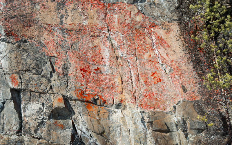 Pääkentän vasemmalla puolella harmaalla kalliopinnalla on kuluneita ja epämääräisiä kuvioita. Alemmista voi hakea eläimeen viittaavia piirteitä. Selkein kuvio on kuitenkin osin jäkälän peittämä, hennoksi kulunut venekuva ylhäällä.