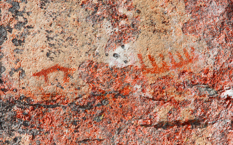 Weathered prehistoric rock painting with identifiable figures.