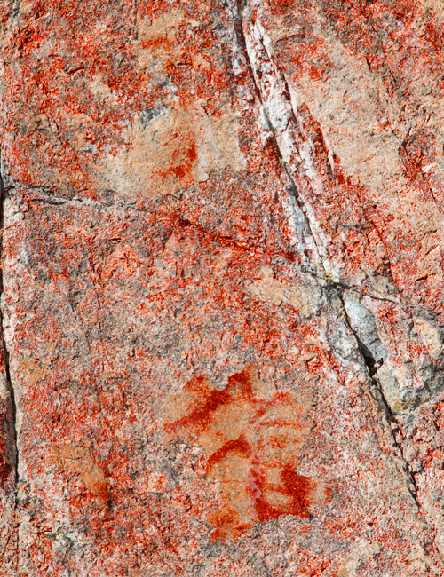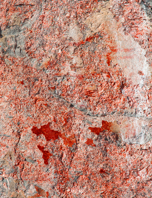 Ajan syömä esihistoriallinen kalliomaalaus, jossa on tunnistettavia kuvioita.