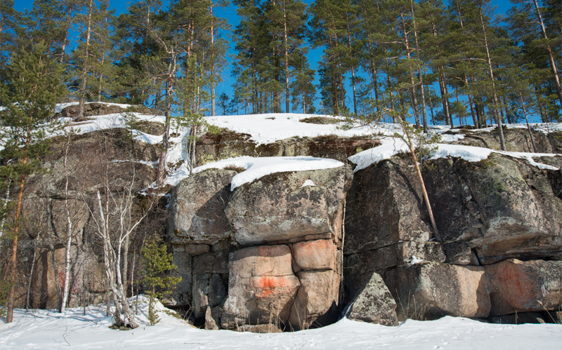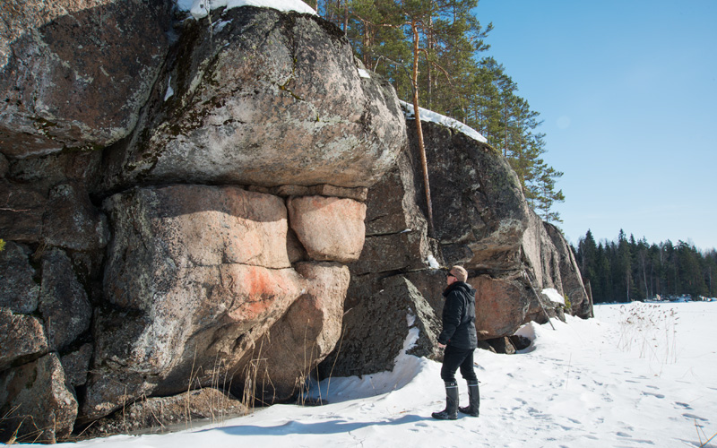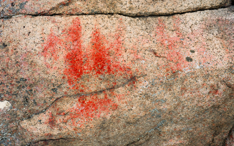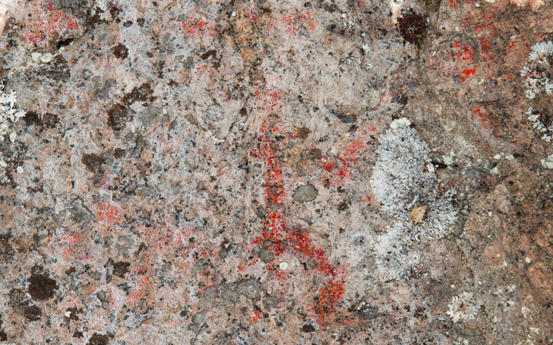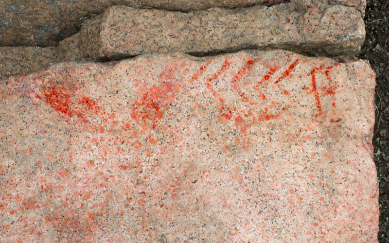 Kauempana oikealla, omassa kallionlohkossaan on kulunutta väriä. Vasemmalla on pitkä pystylinja ja sen oikealla puolella epämääräisiä värijälkiä.