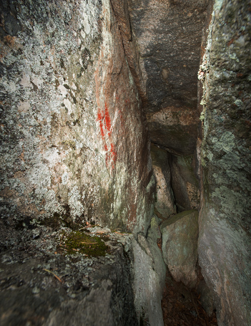 Järven rannalla, isojen kivien muodostaman kapean onkalon sivuseinämässä on selvää punaista väriä. Ajoitus jää epävarmaksi.