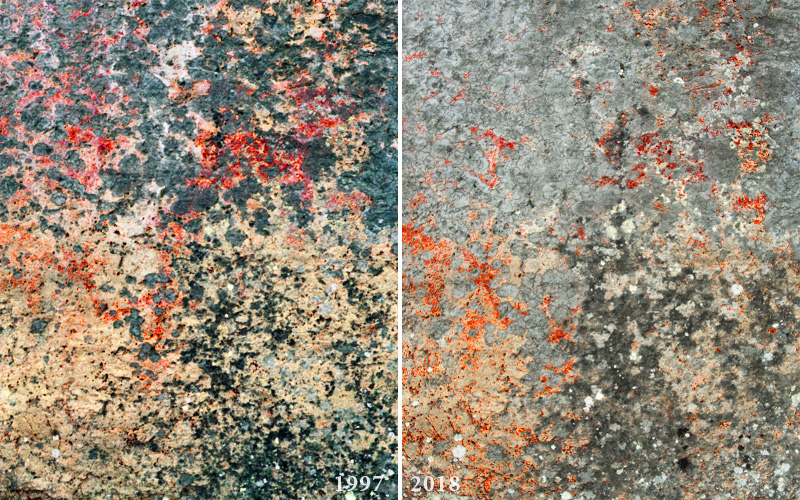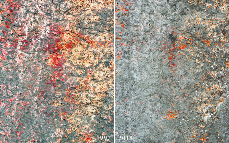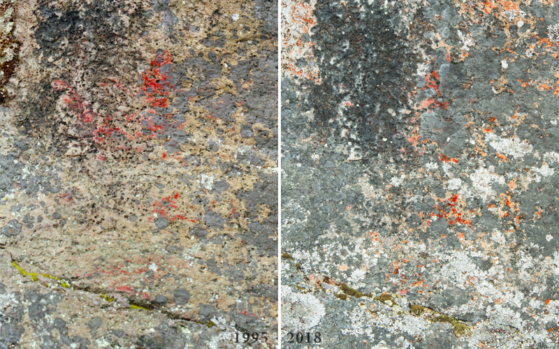 Kulunut kallio nousee kapean rantakaistaleen takaa. Värijälkiä on pitkällä matkalla, mutta tunnistettavat kuviot ovat vähissä. Laajin maalattu alue on vasemmalla. Siellä oli vielä 2000-luvun alussa tunnistettavissa kaksi ihmishahmoa, joista ylemmällä näytti olevan käärmemäinen sauva kädessä ja alemman vasemmanpuoleiseen käteen on kuvattu neljä–viisi sormea. Jäkälän kasvu on kuitenkin peittänyt ihmishahmot lähes kokonaan. Samoin on käynyt maalausalueen keskiosan muutamille kuvioille. Kauempana oikealla ovat kallion selvimmät hahmot – pieni hirvieläin ja sivusta kuvattu ihminen. Ne ovat edelleen näkyvissä.