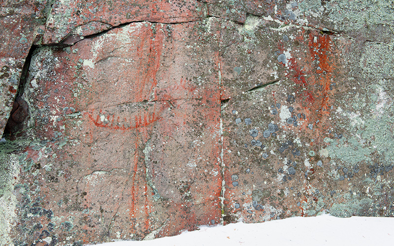 Laaja kallioseinämä peittyy puuta kasvavan leveän rantakaistan taakse. Kallion molemmin puolin on rakennettu kesämökki. Tasaiseen kallioon on maalattu suurikokoinen venekuva, josta voi laskea kaksitoista miehistöviivaa. Tästä yläoikealle kalliossa on pienempi venekuvio ja kauempana oikealla vielä pieni pysty värijälki sekä levinnyttä väriä.