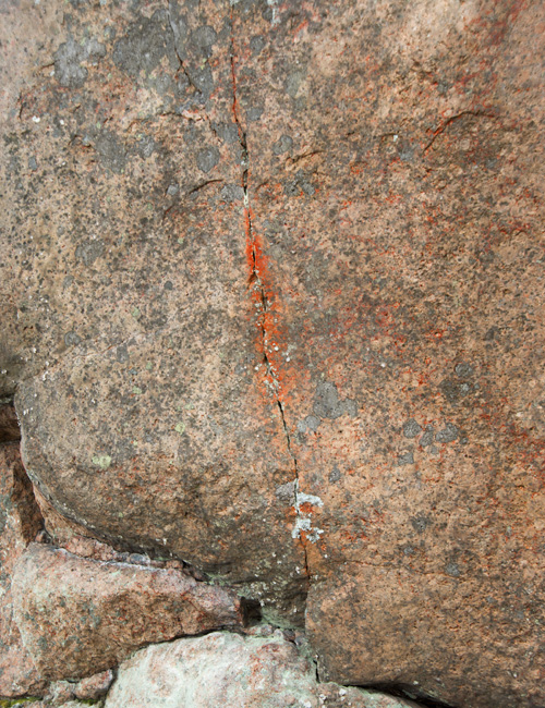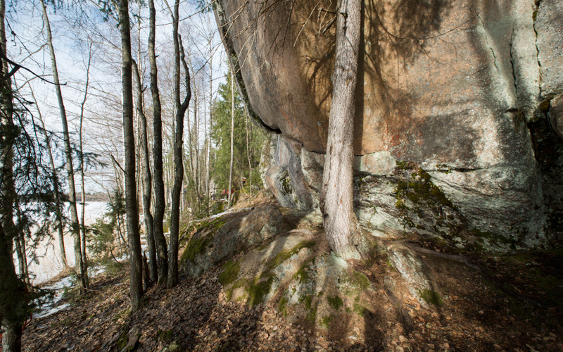 Pienen rantakaistaleen takana, kesämökin tuntumassa kallio kaartuu voimakkaasti sisäänpäin. Kalliosta erottuu selvästi kuvioita, joiden tarkka muoto on kuitenkin vaikeasti hahmotettavissa. Hirvi, kaksi ihmistä ja kulunut vene ovat kuitenkin tunnistettavissa.