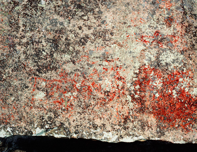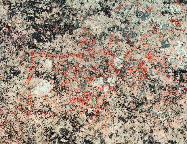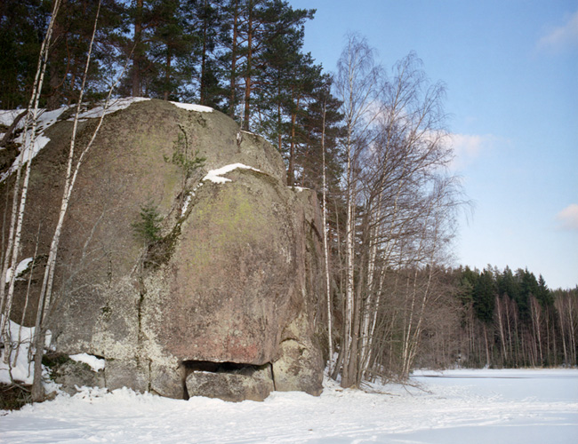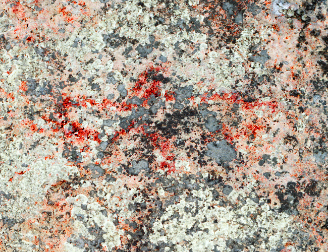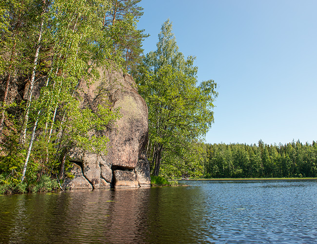 Vaikuttavan muotoisessa, suoraan vedestä nousevassa kalliossa erottuu punaista siellä täällä. Lähes näkymättömiin kulunut kalliomaalaus, josta on edelleen erotettavissa muutama hirvikuva.
