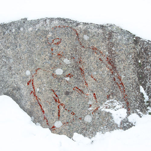 Padasjoen Paljaskallion rantaan on maalattu kyyryssä istuva ihminen. Maalaus ajoittuu 1900-luvulle.