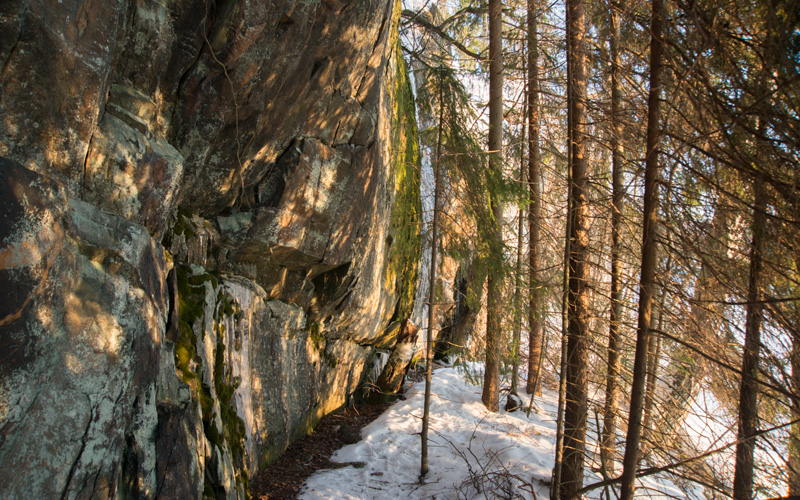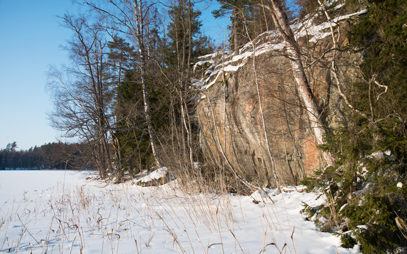 Maalauskohdan vasemmalla puolen maa nousee yläspäin ja kallion edustalla kasvaa paksumpia puita. Parin metrin korkeudella maanpinnasta kalliossa on selvää punaväriä, joka kuitenkin jää osittain valkean jäkälän alle. Väri on levinnyttä eikä varmoja kuvioita voi erottaa, kuitenkin ylhäällä näyttäisi olevan neljä–viisi pystyä viivaa.