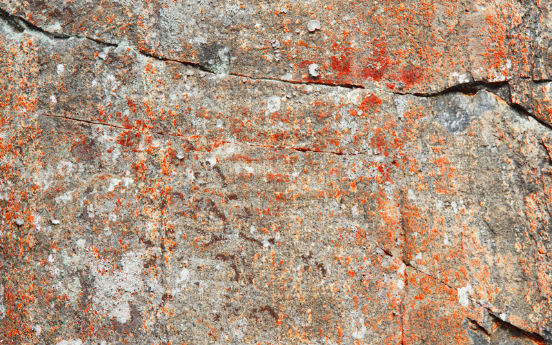 Ajan kuluttama esihistoriallinen kalliomaalaus, jossa on tunnistettavia kuvioita.
