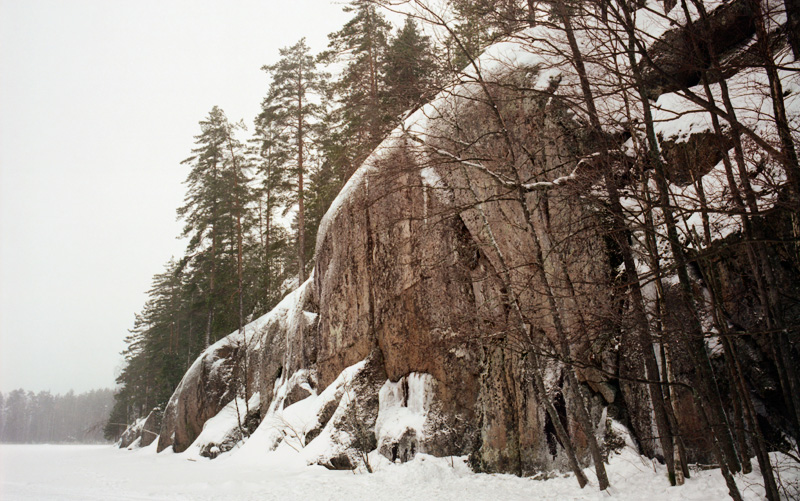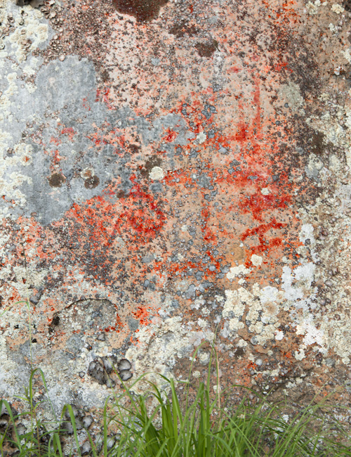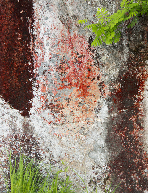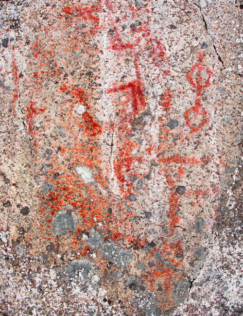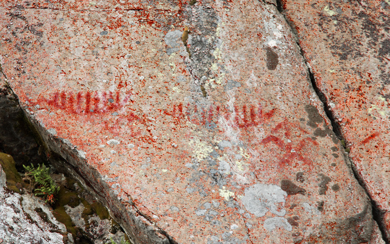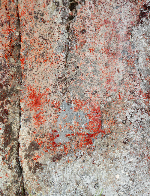 Puolitoista metriä edelleen oikealle on seuraava maalauskohta. Sen puuroutuneesta ja osin jäkälän peittämästä väristä ei voi hahmottaa tunnistettavia kuvioita.