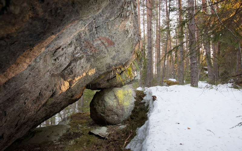 Noin 300 metriä Suurijärven itäpuolella, metsän keskellä kallion reunalla kohoaa siirtolohkare, joka etelän puoleiselta kärjeltään nojaa pienempään kiveen. Lohkareen länsireuna muodostaa lipan, jonka alle jää suojainen kolo. Kolon katossa, lipan alla on pieni kalliomaalaus. Maalaus koostuu kahdesta päällekkäin asetetusta kuviosta. Ylempi muistuttaa muodoltaan E- ja alempi F-kirjainta, niin että piikit osoittavat alas. Kuvioista voi tulkita kaksi eläinhahmoa, joista ainakin alempi katsoo vasemmalle. Löydön julkistamisen yhteydessä keväällä 2015 eläimet nimettiin karhuiksi, mutta tulkintaa ei voi pitää varmana. Eläinhahmoista kuitenkin lienee kyse. Maalauksen läheisyydestä, noin kilometrin etelään, on löydetty myös seitsemän kuppikiveä.