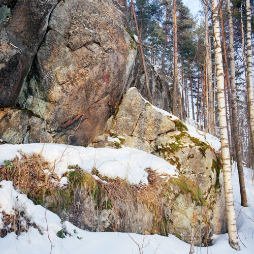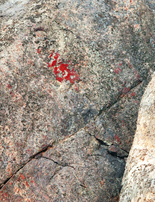 Rantapuuston takaisessa kuluneessa kalliossa on voimakkaan punainen läiskä. Rippeitä väristä on laajemmaltikin kallion pinnassa. Vakuuttavimmat maalausjäljet ovat oikealla, mutta niistäkään ei voi varmuudella tunnistaa kuviota.