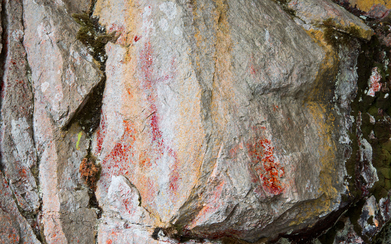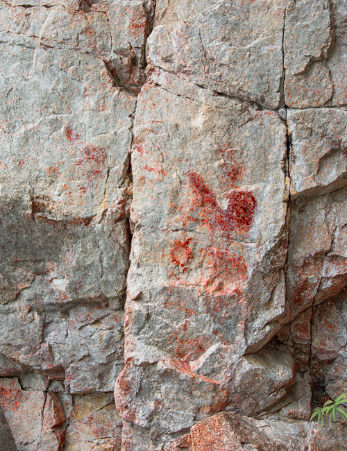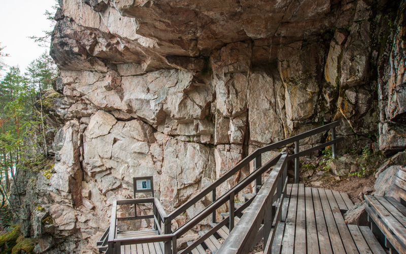 Massiivinen kallio ja komea puoliluola, jonne on rakennettu katselutelineet. Tunnistettava ihmishahmo on kallionkulmassa telineiden tuntumassa. Lisäksi alempana vasemmalla on tunnistamattomia punaisia jälkiä.